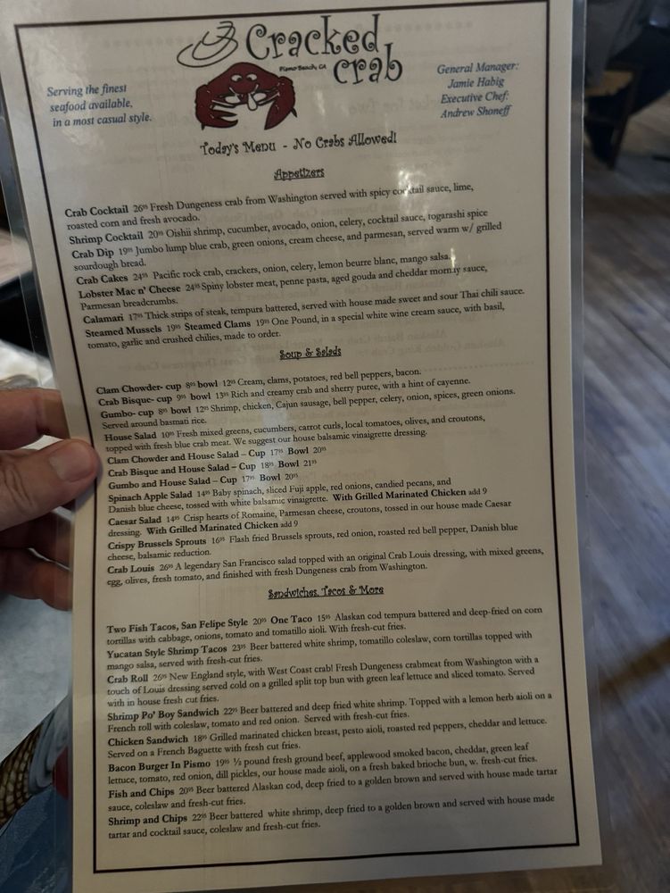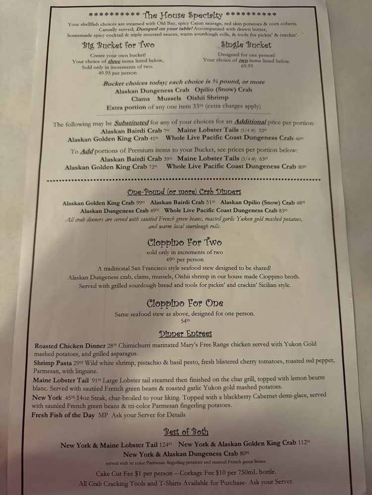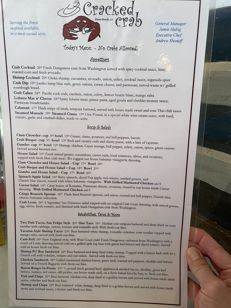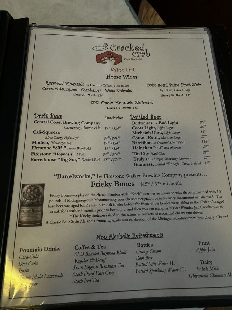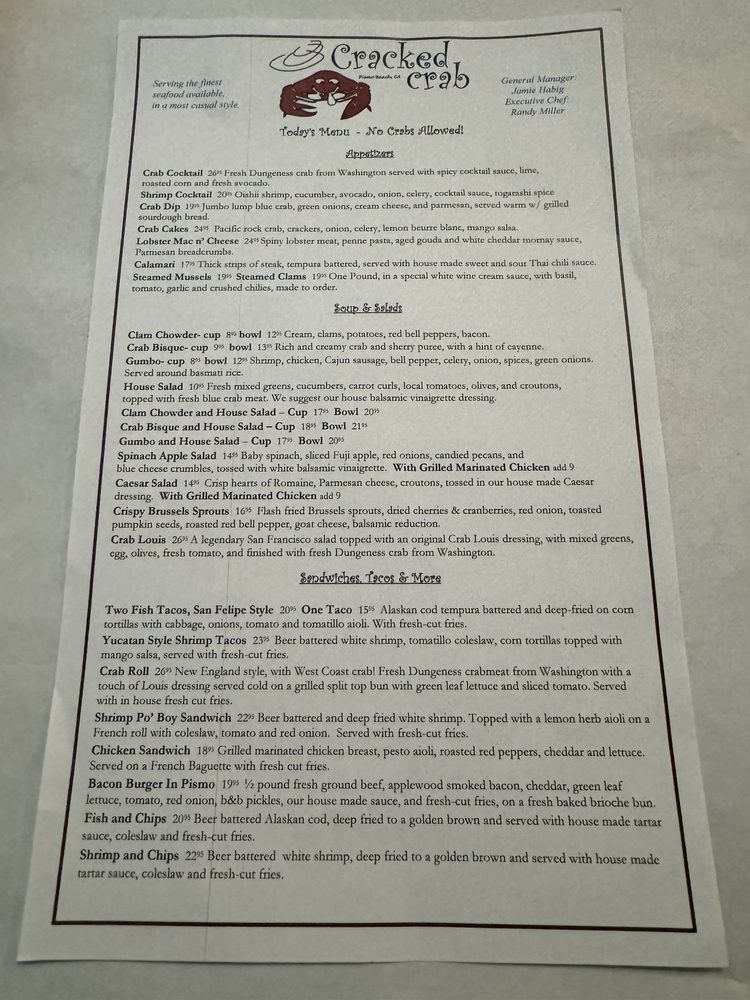 Cracked Crab is a seafood restaurant in Pismo Beach, CA, offering a variety of fresh and delicious fish and seafood dishes. The menu features options like crab rolls, clam buckets, fish and chips, and more. Customers praise the abundant and flavorful seafood, especially the crab dishes. With a casual atmosphere, Cracked Crab provides a family-friendly dining experience with comfortable seating options both indoors and outdoors. Their service is attentive and friendly, guiding diners through the menu and ensuring a pleasant dining experience. Popular among locals and tourists alike, Cracked Crab is a must-visit spot for seafood lovers craving a memorable meal by the coast.