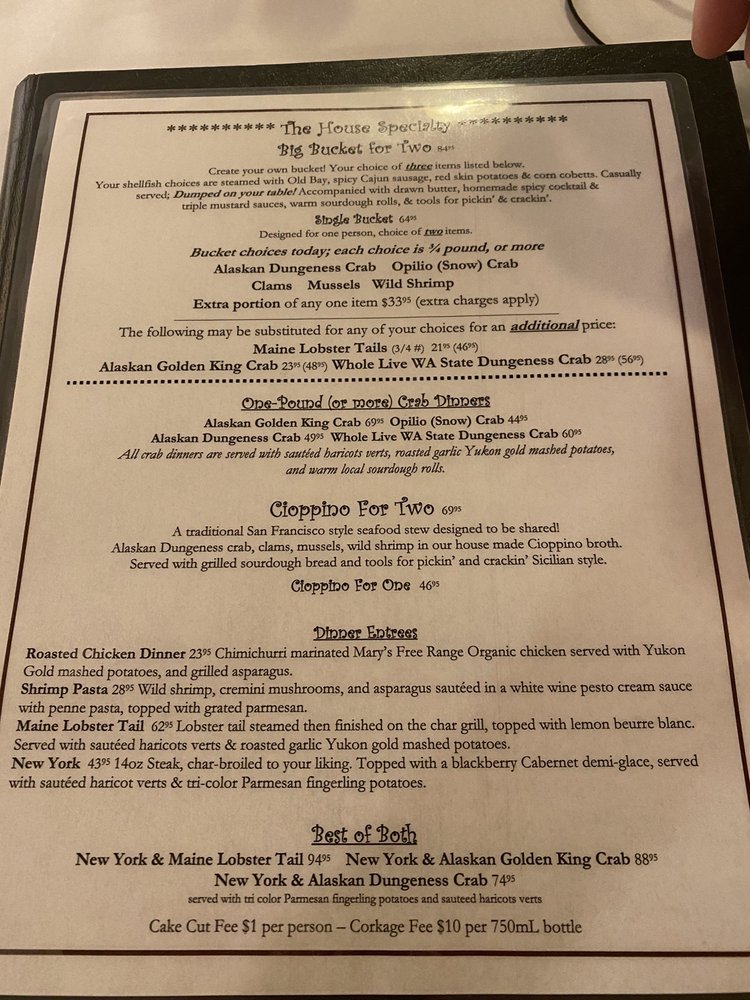 A traditional san francisco style seafood stew designed to be shared! Alaskan dungeness crab, clams, mussels, wild shrimp in our house made cioppino broth. Served with grilled sourdough bread and tools for pickin' and crackin' sicilian style.
